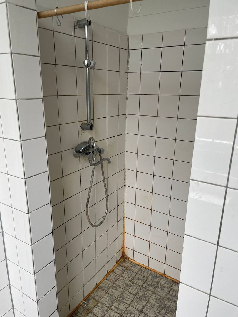 Achtergelegen badkamer met douche, wastafel en wasmachine aansluiting
