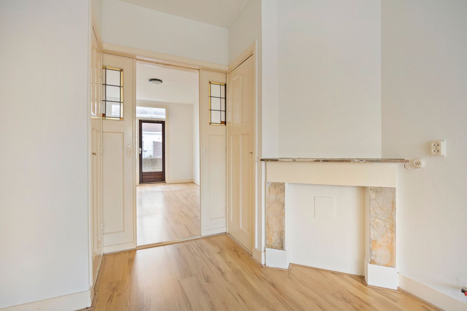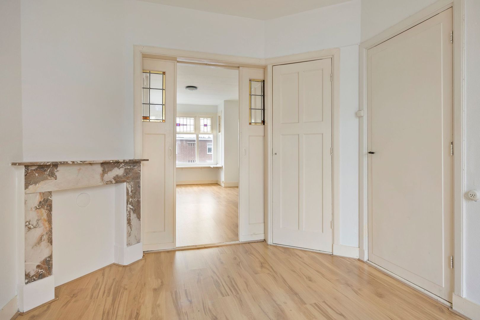 Woonkamer ensuite met originele schuifdeuren voorzien van glas-in-lood ramen