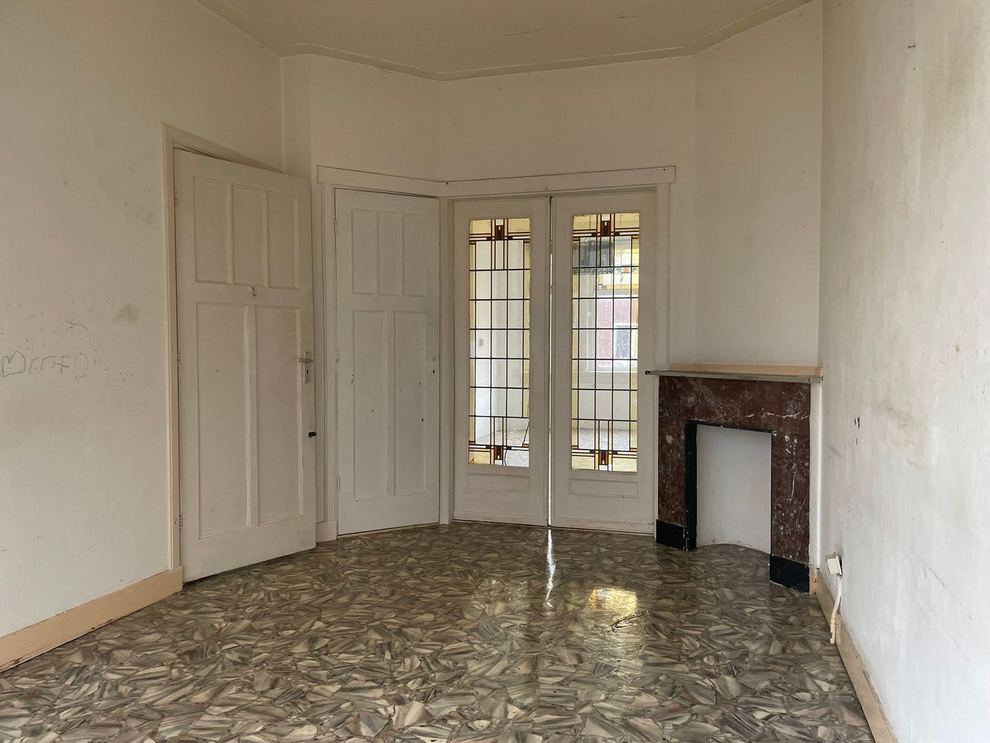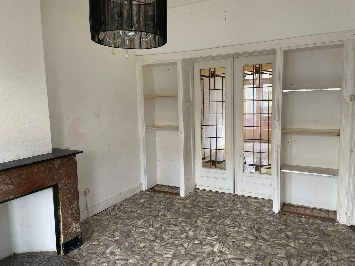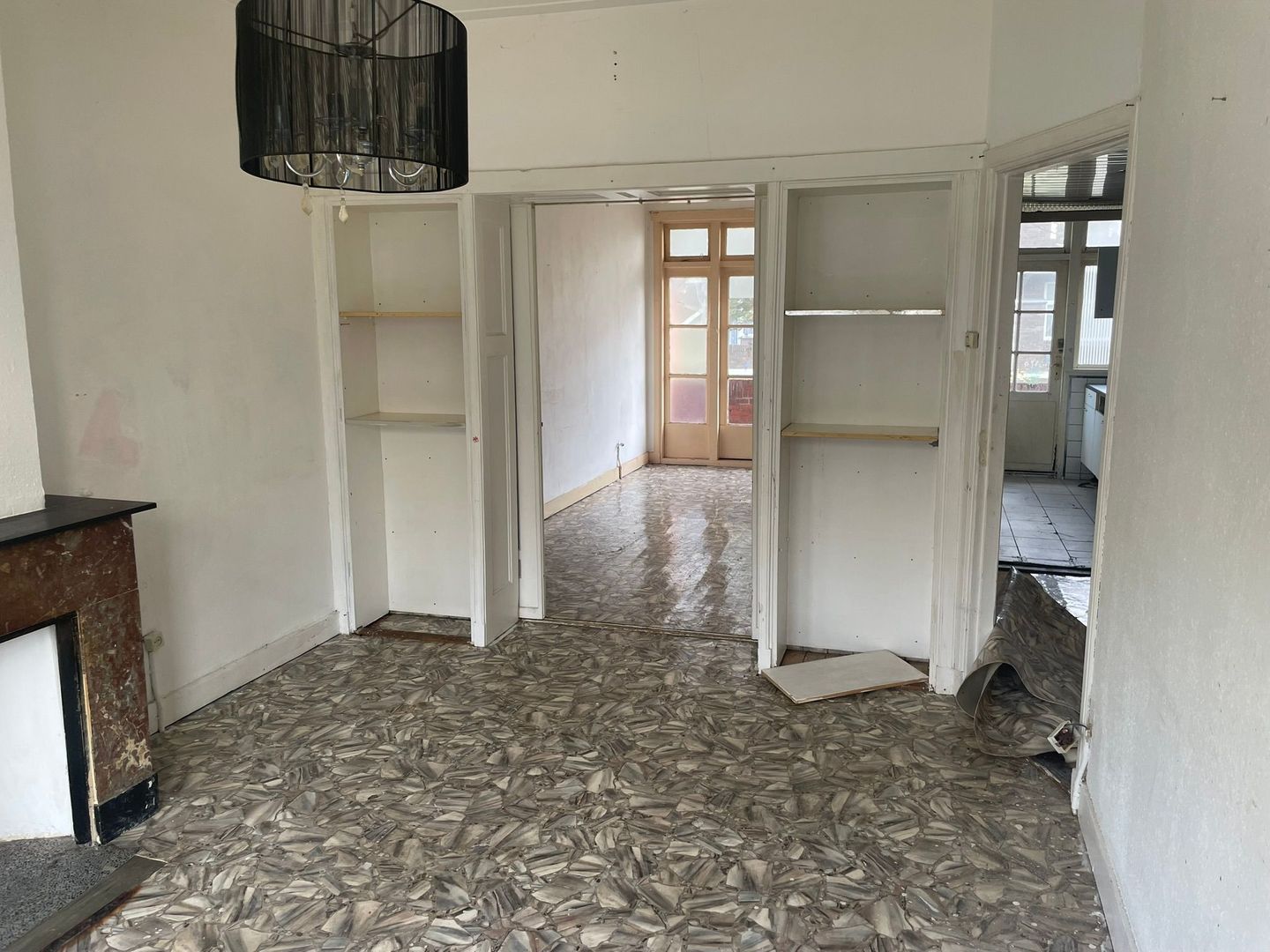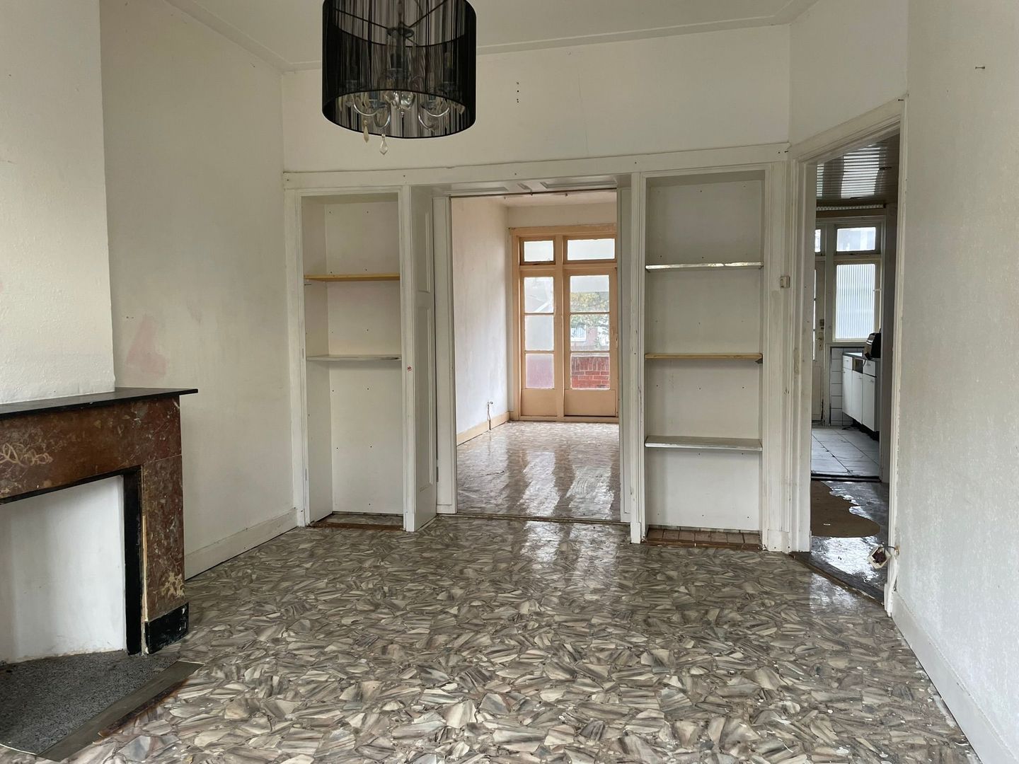 Woonkamer ensuite met vaste kasten, schuifdeuren en toegang tot achterbalkon