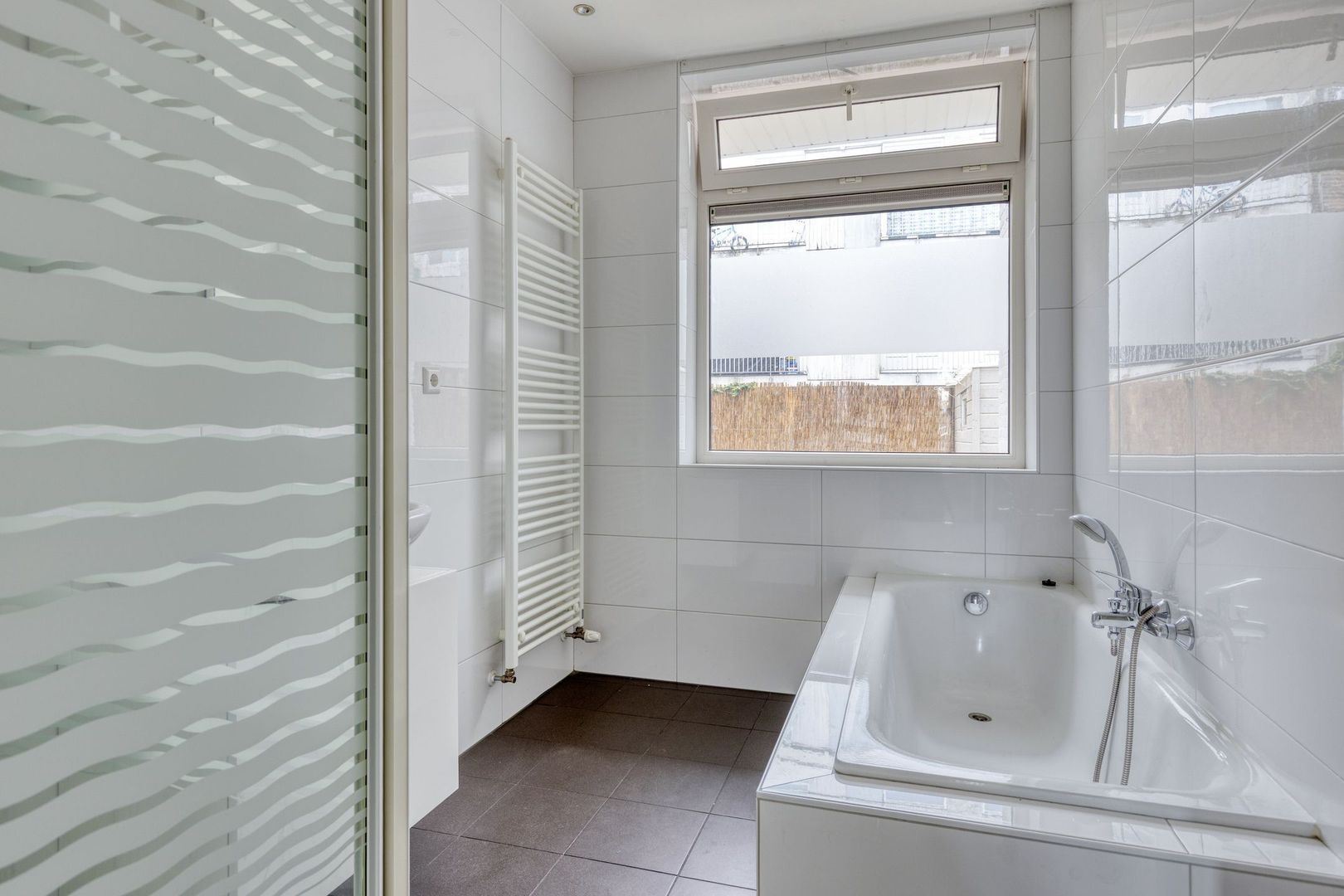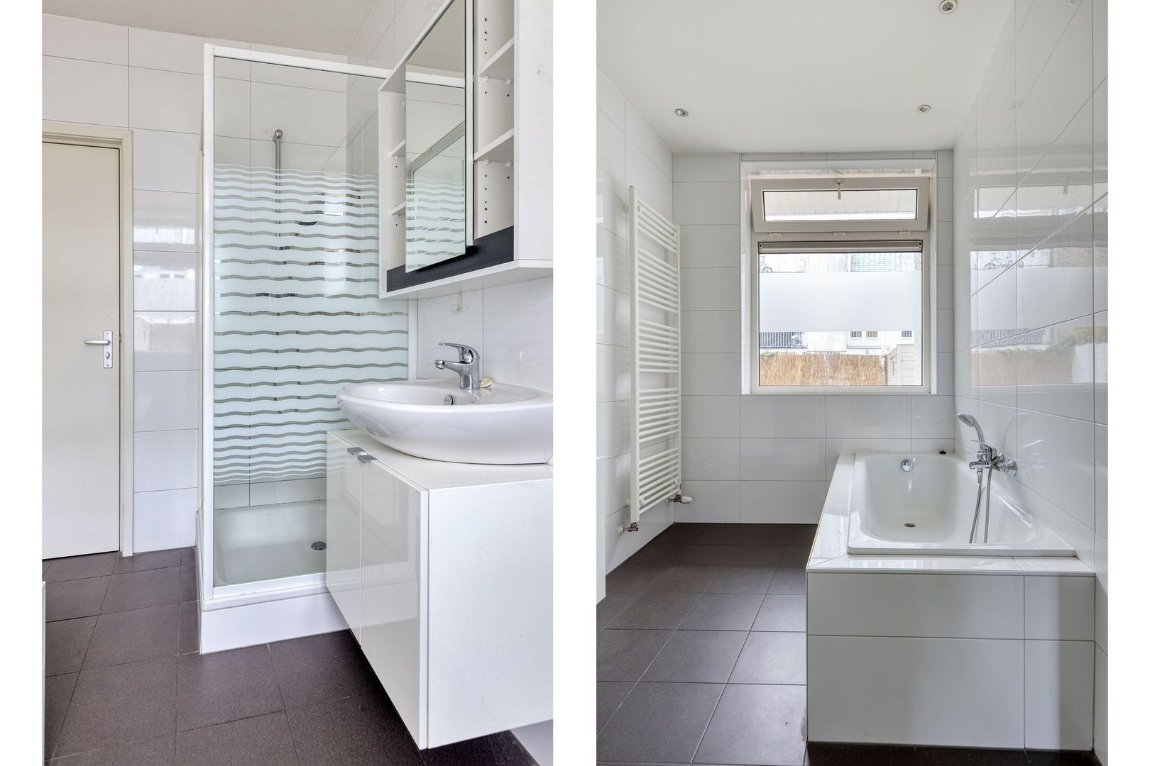 Badkamer met ligbad, aparte douche, vaste wastafel en handdoekenradiator