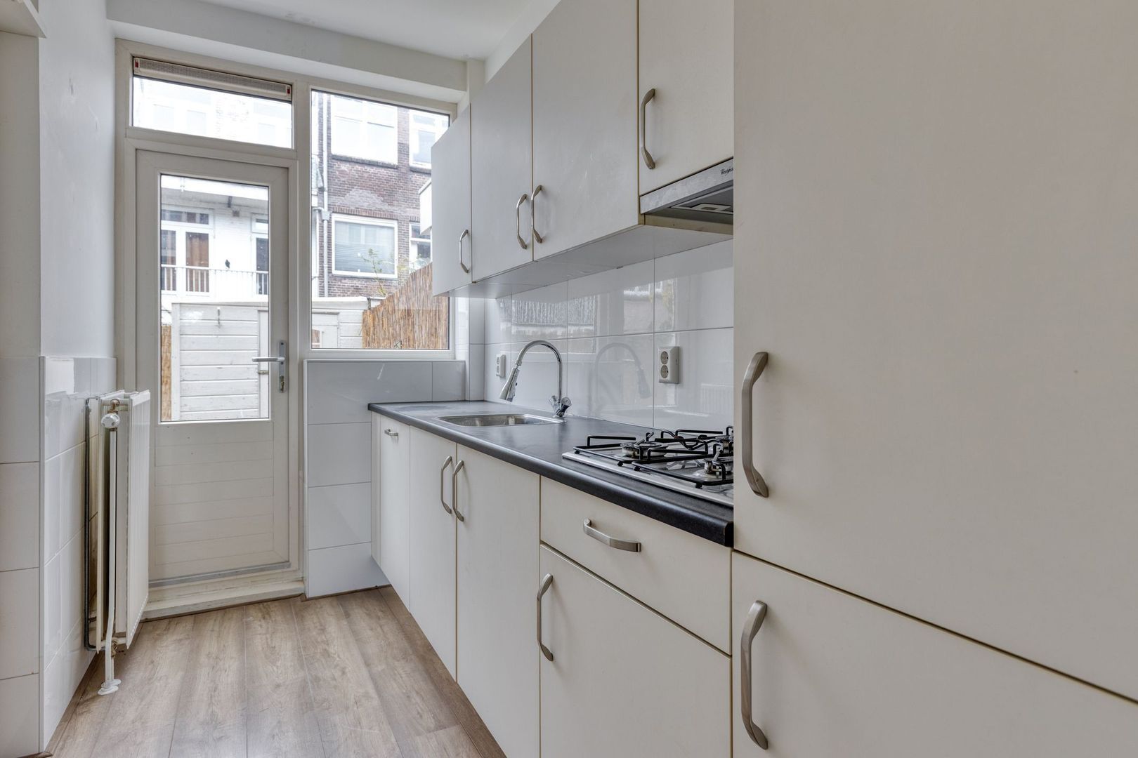 Moderne. keurige en energiezuinige 3-kamer parterrewoning met luxe keuken voorzien inbouwapparatuur, luxe badkamer met ligbad, grotendeels laminaatvloeren en zonnige achtertuin Zuid Oosten. Energielabel B. Vrij uitzicht over de kade.