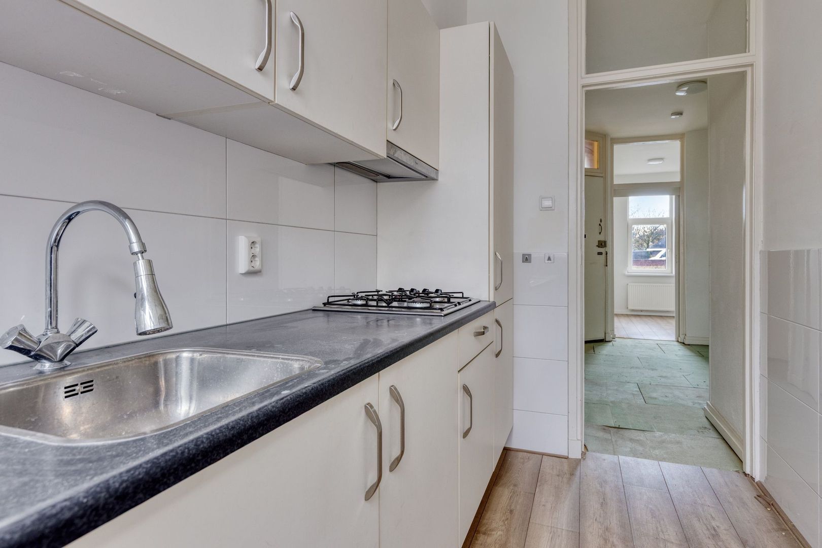 Keuken v.v. kunststof aanrecht met onder- en bovenkasten, alsmede een inbouw koel/vries combinatie, vaatwasmachine, kookplaat en afzuigkap