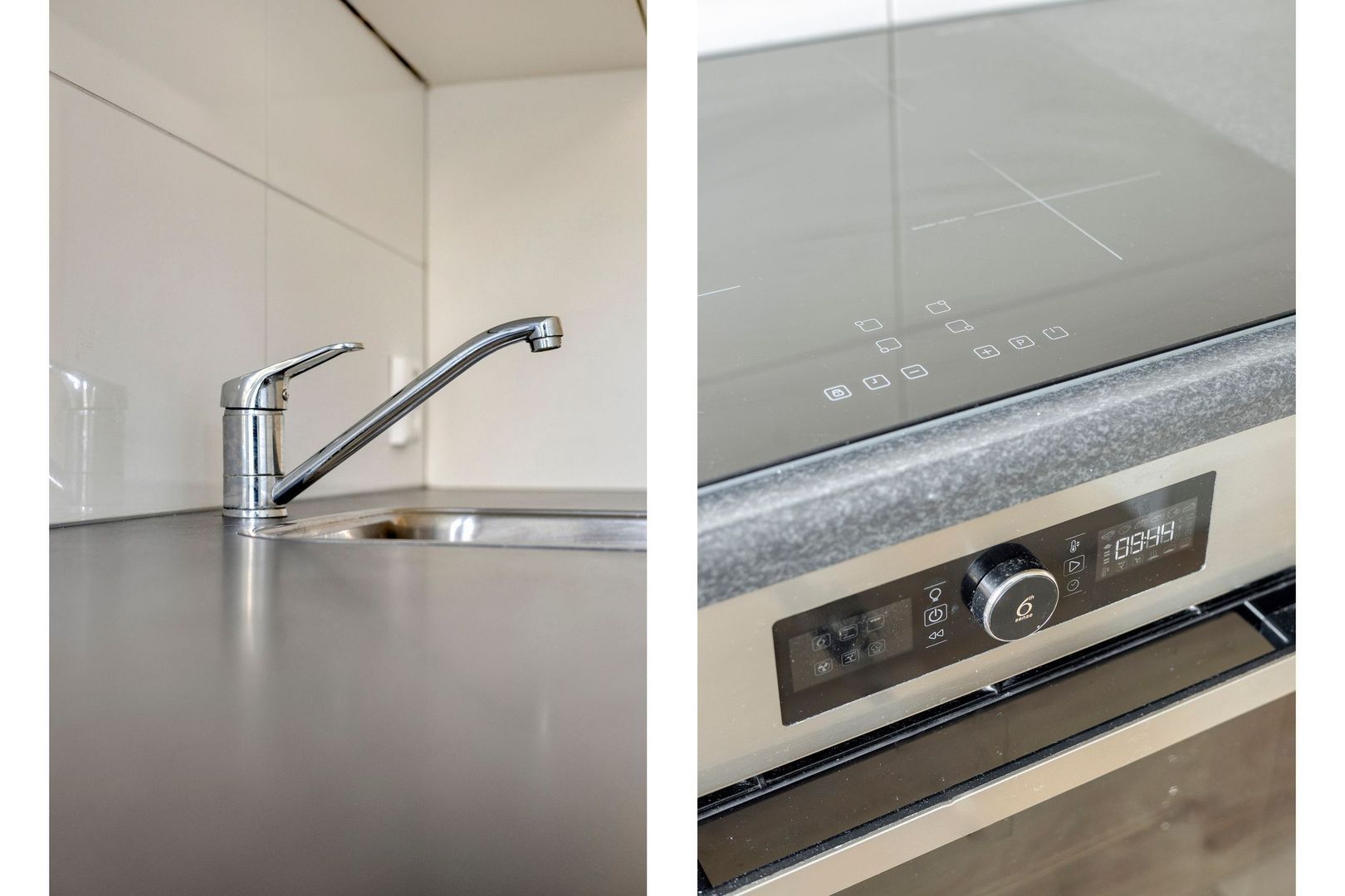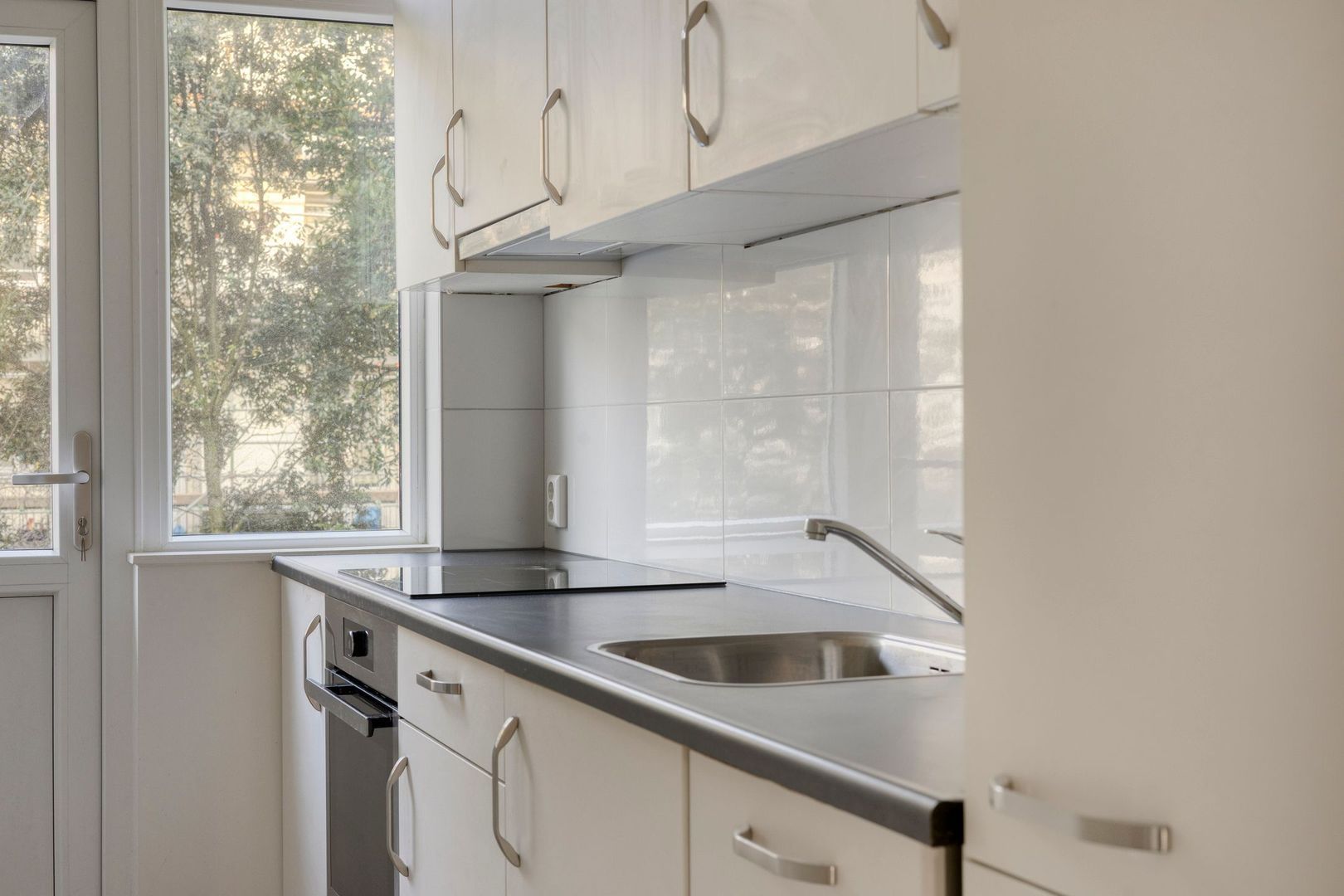 Keuken met inbouwapparatuur zoals oven, elektrische kookplaat, inbouw afzuigkap, koel/vries combinatie en vaatwasmachine