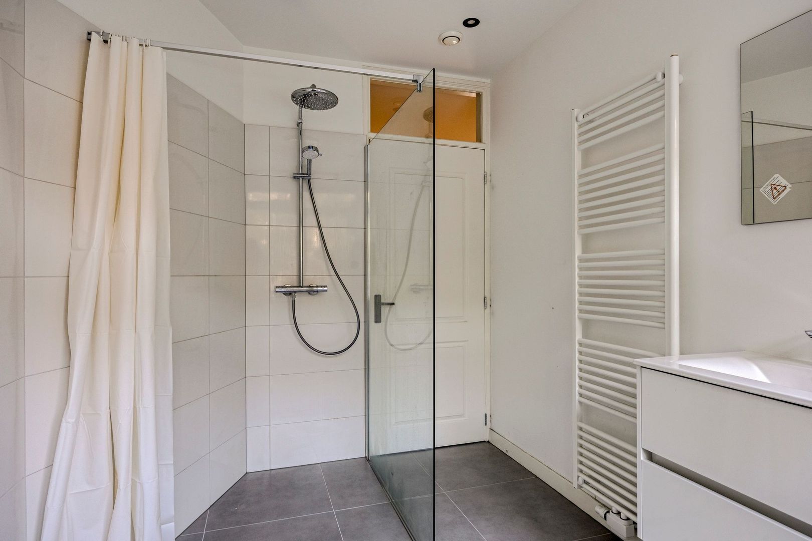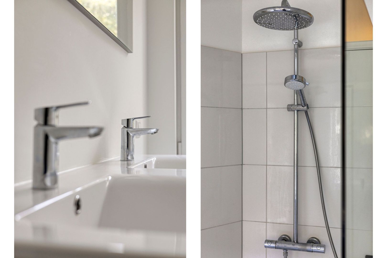 Luxe badkamer met inloop(strot-)douche, thermostatische mengkraan en dubbele vaste wastafel.