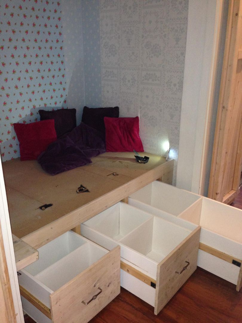entree; gang met handige bedstee (ca. 1.95 m x 1,50m) voorzien van diverse opberglades;
