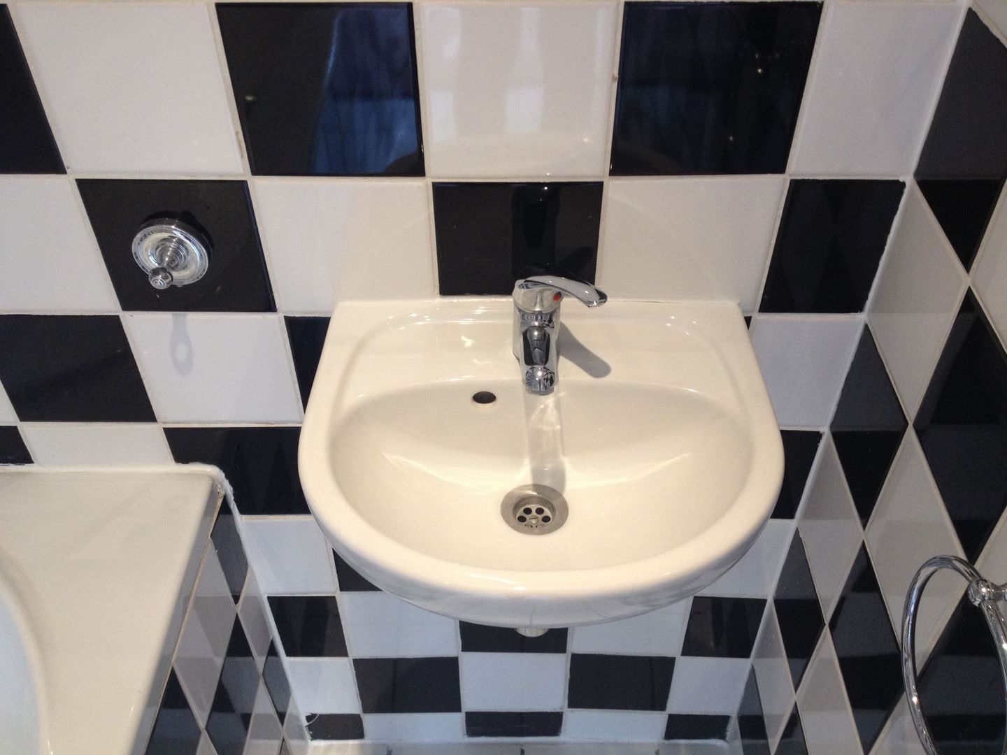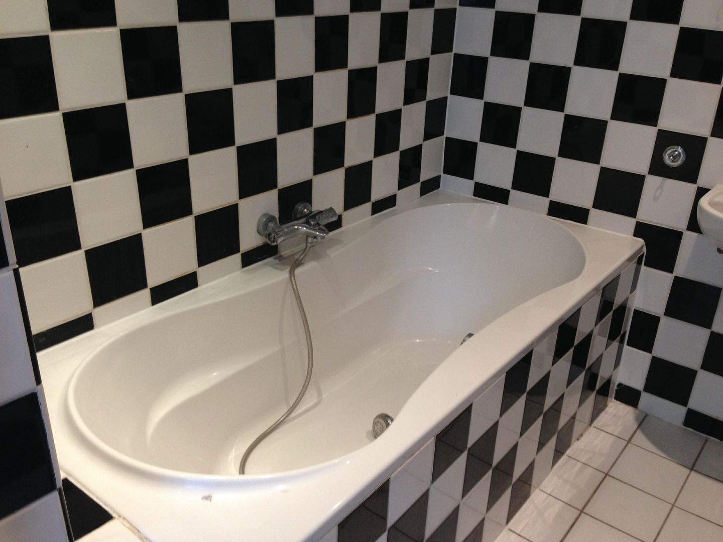 Badkamer met ligbad, vaste wastafel; apart toilet;