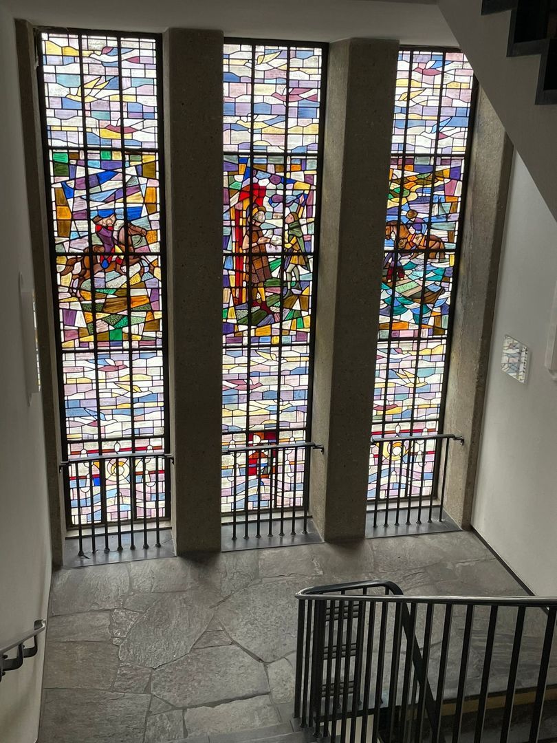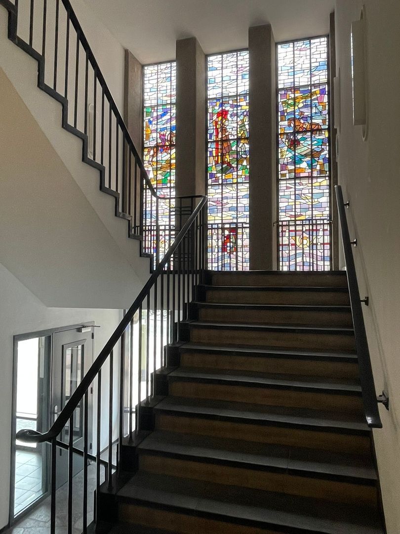 Met de lift of trap via de binnentuin naar 2e etage van het complex.