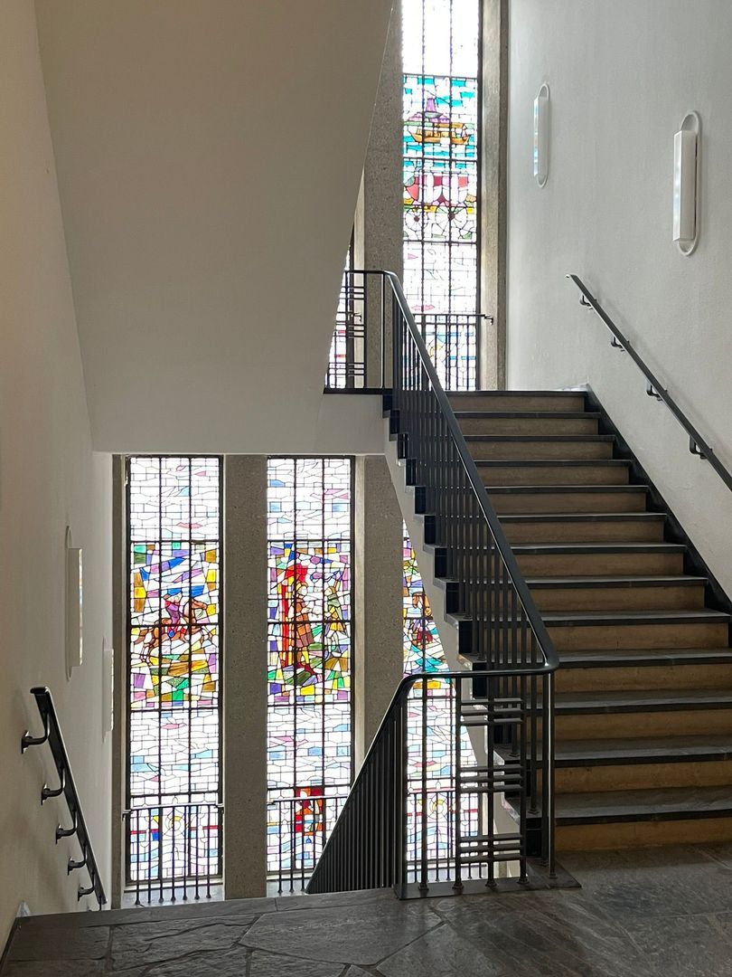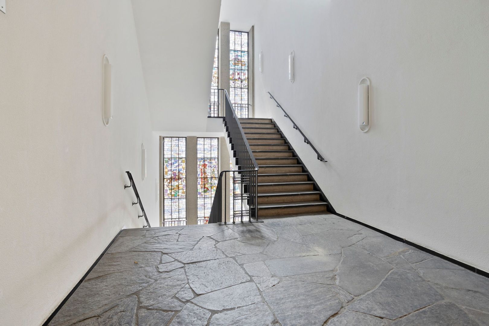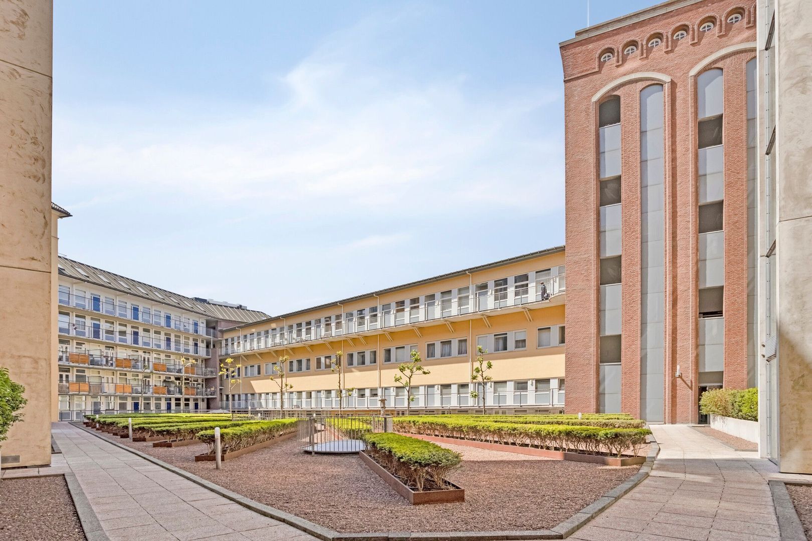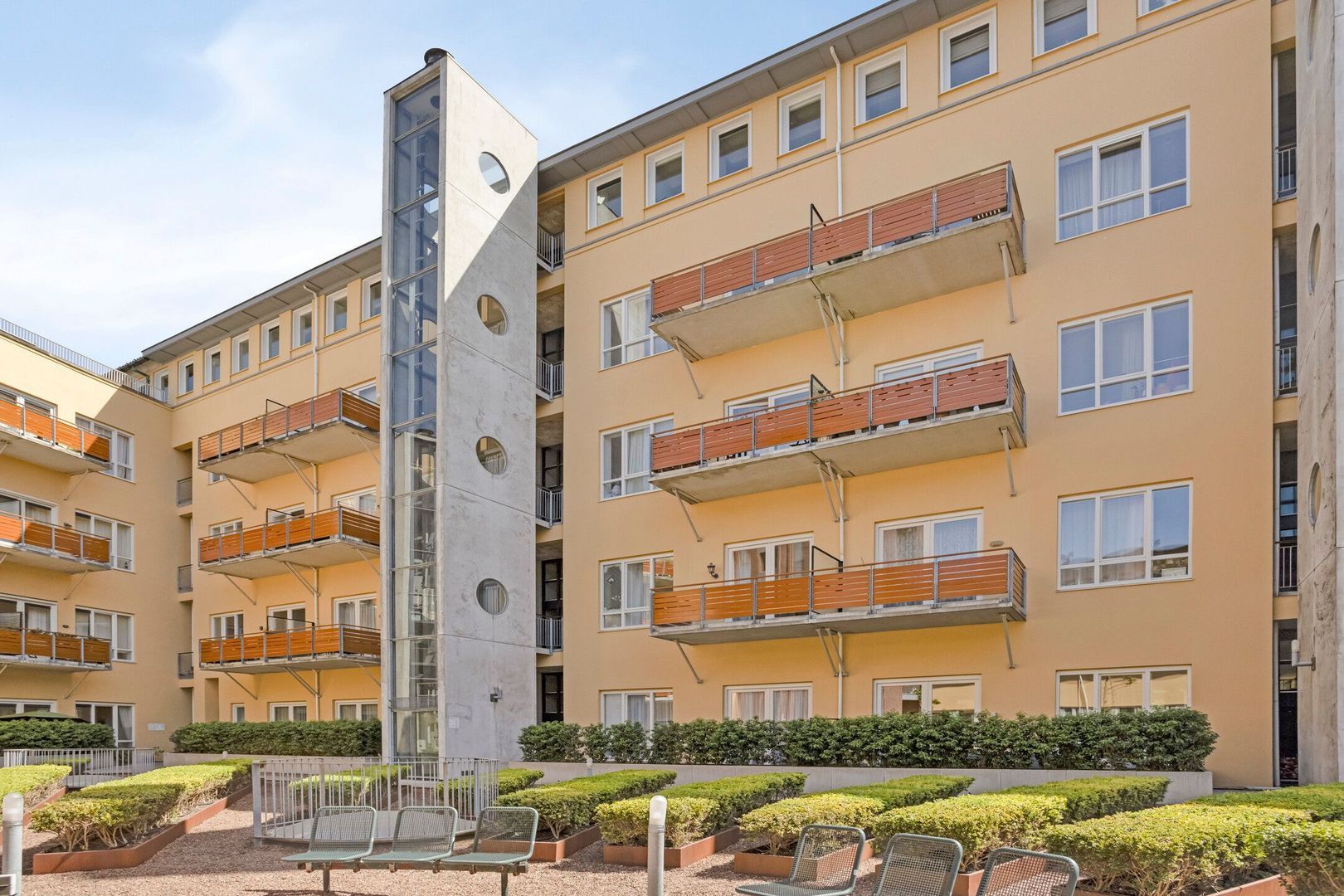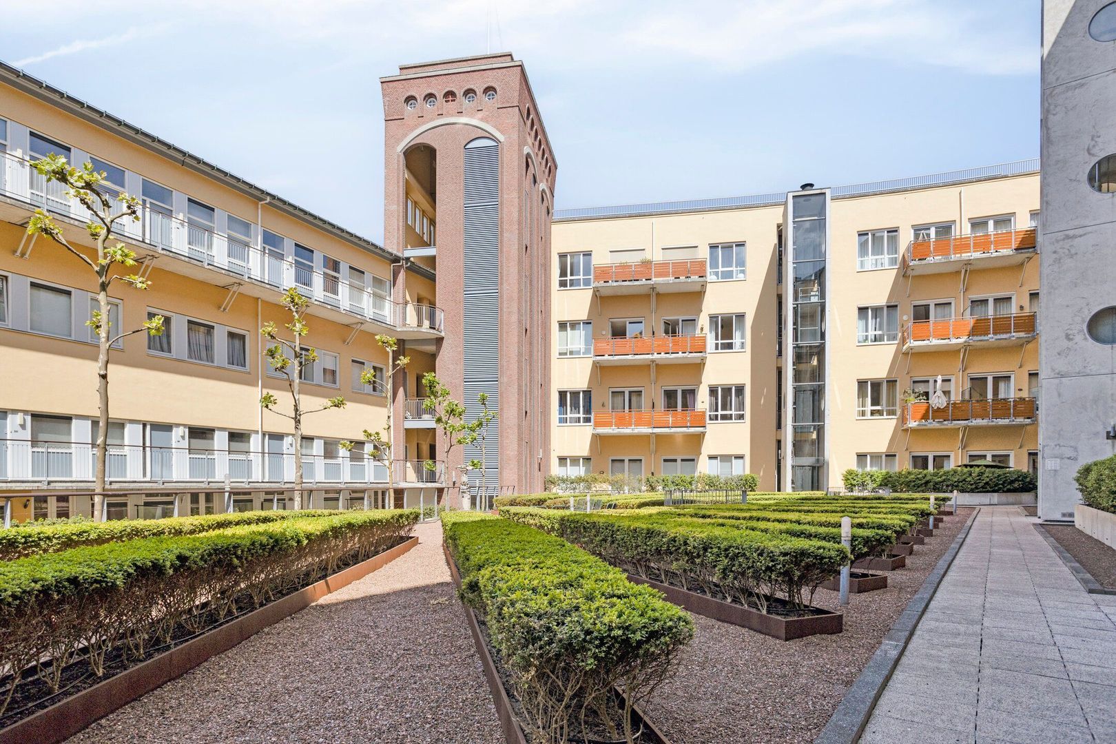 Met de lift of trap via de binnentuin naar 2e etage van het complex.