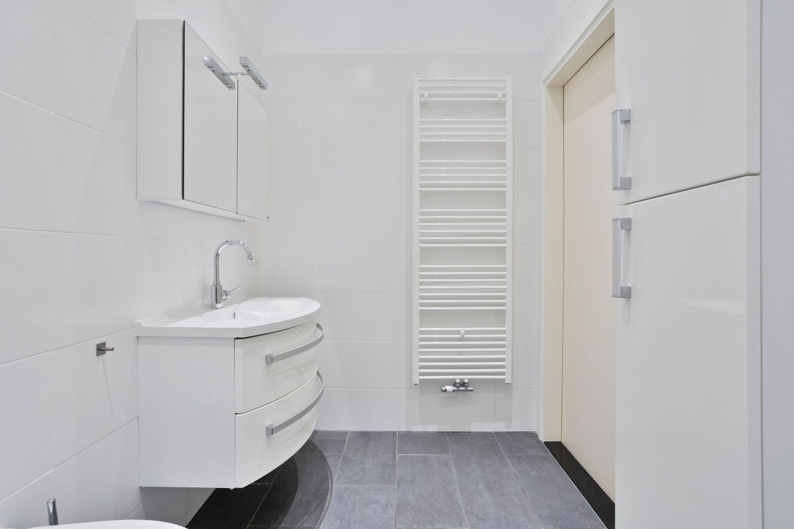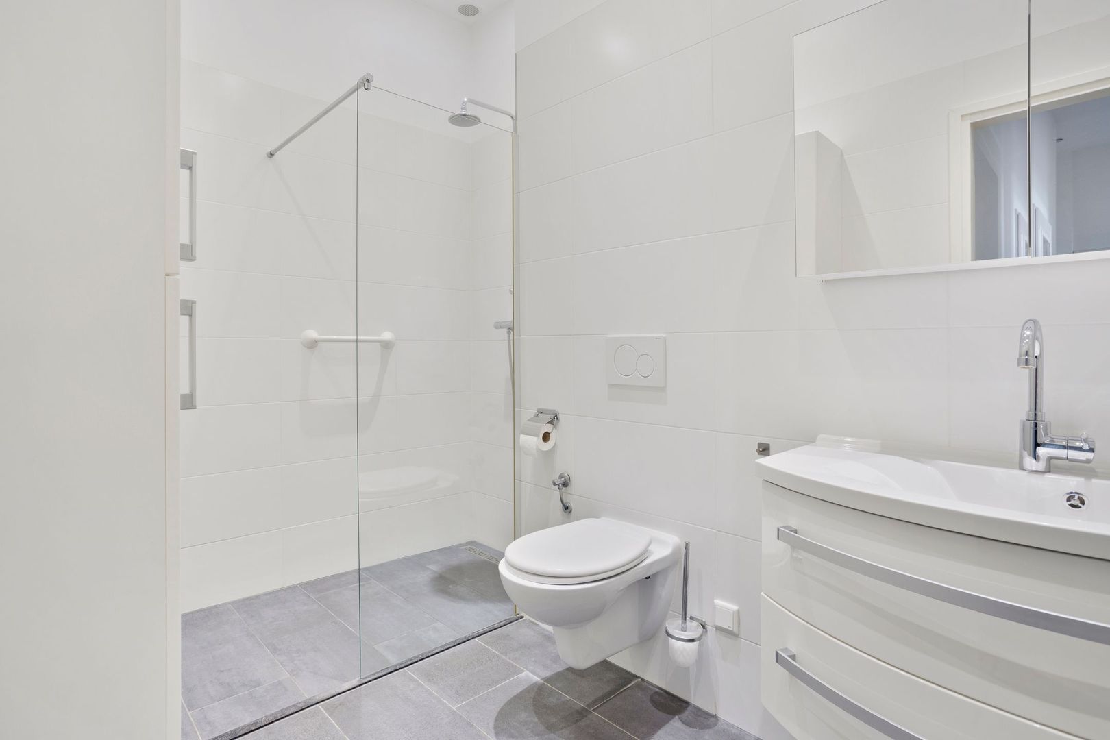 Grote badkamer met inloopdouche, wastafelmeubel en inbouwcloset.